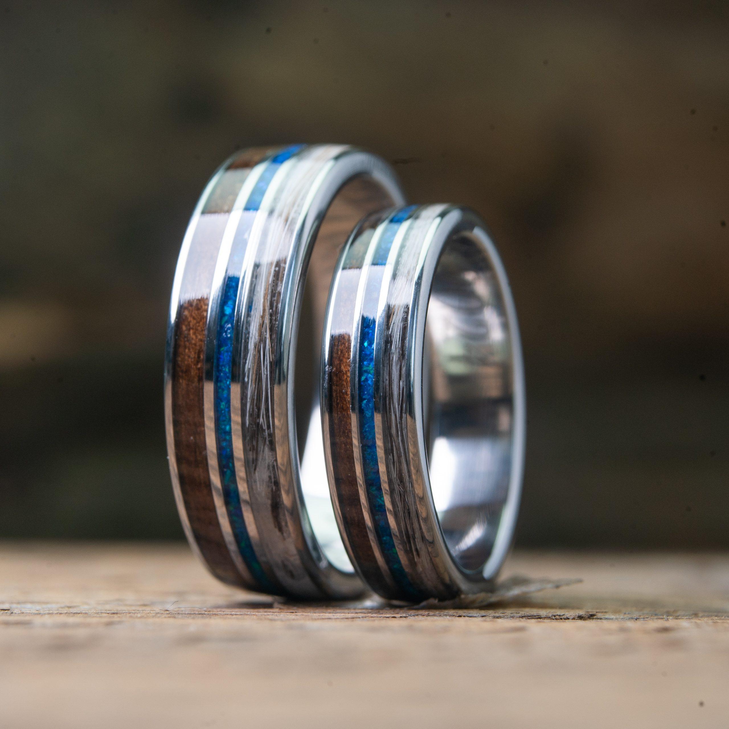 Tentokrát nám zákazníci priniesli srsť svojich troch psov. Všetku sme skombinovali a vložili do jednej časti prsteňa tak, aby zostali navždy spolu. Do stredu si vybrali prúžok z modrého opálu, ktorý dodáva prsteňu výrazný akcent. Celú kombináciu vyvážili elegantným eukalyptovým drevom.
