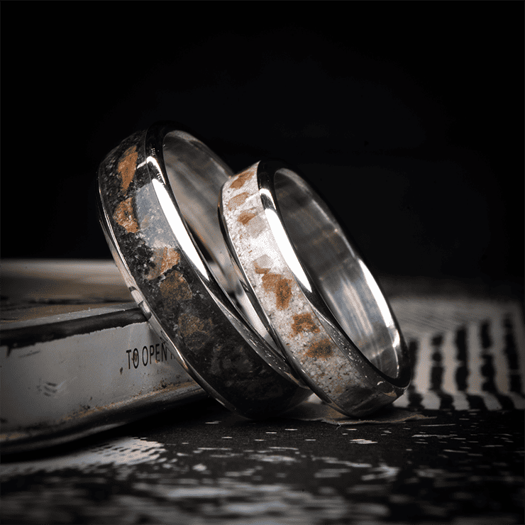 Aj tieto obrúčky, vyrobené na prianie našich zákazníkov, v sebe ukrývajú jedinečný príbeh. Časť obrúčok tvorí piesok z pláže Kommos na Kréte, ktorá v ich živote zohrala významnú úlohu. Prvýkrát sa na tejto pláži stretli ako kamaráti, druhýkrát sa tam zasnúbili a tretíkrát sa sem vrátia už ako manželia.