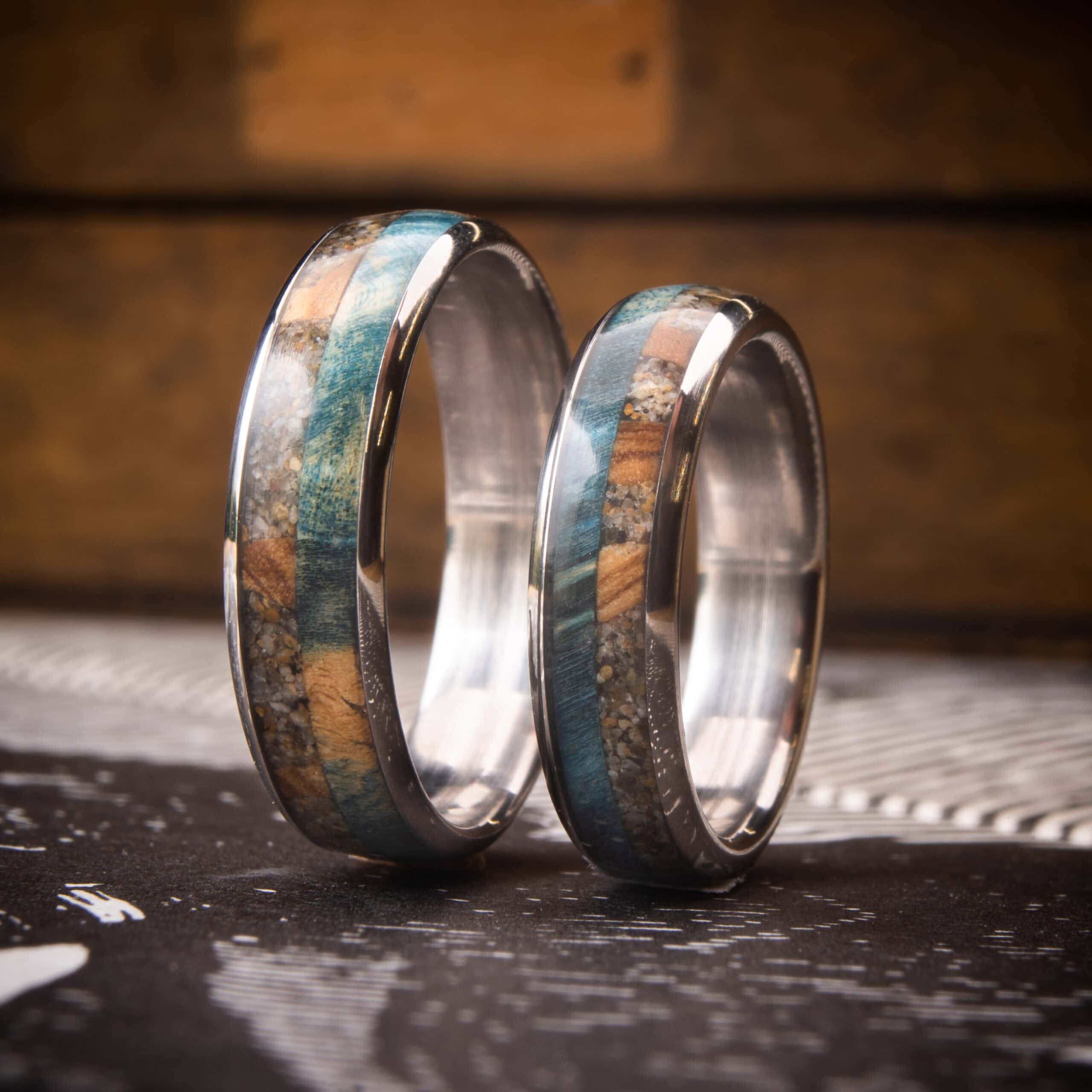 Mali sme tú česť vyrobiť obrúčky pre pár, ktorý cestovanie a spoznávanie nových krajín vníma nielen ako obrovskú vášeň, ale ako súčasť svojho životného štýlu. Tmavý piesok z Etny, bledý piesok z Barbadosu a skamenelé drevo zo stromu baobab – to sú vzácne kúsky, ktoré si naši zákazníci priniesli zo svojich spoločných ciest. My sme tieto matieriály opracovali a zakomponovali do ich obrúčok, aby si spomienky na spoločné dobrodružstvá mohli nosiť neustále so sebou.