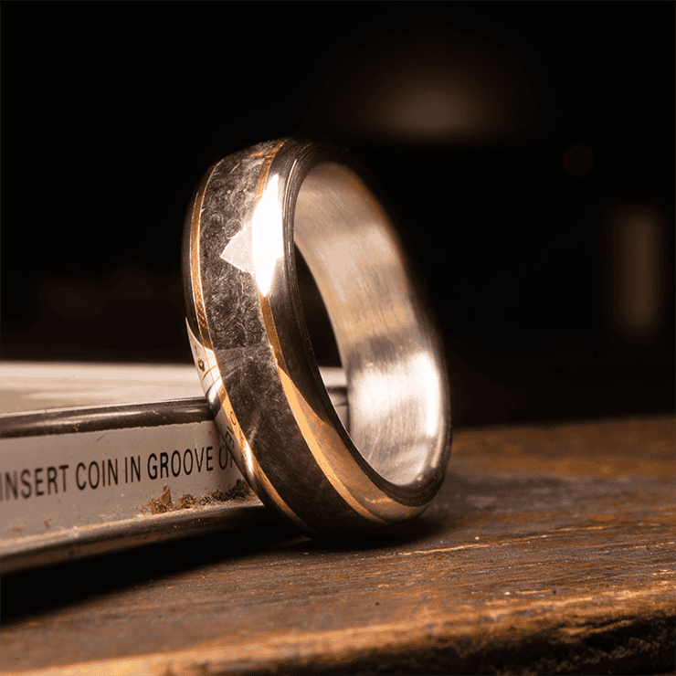Z deky sme vytvorili kompozitný materiál, ktorý sme následne zapracovali do titánového jadra a pre jeho lepšie vyniknutie orámovali dvomi zlatými prúžkami.
