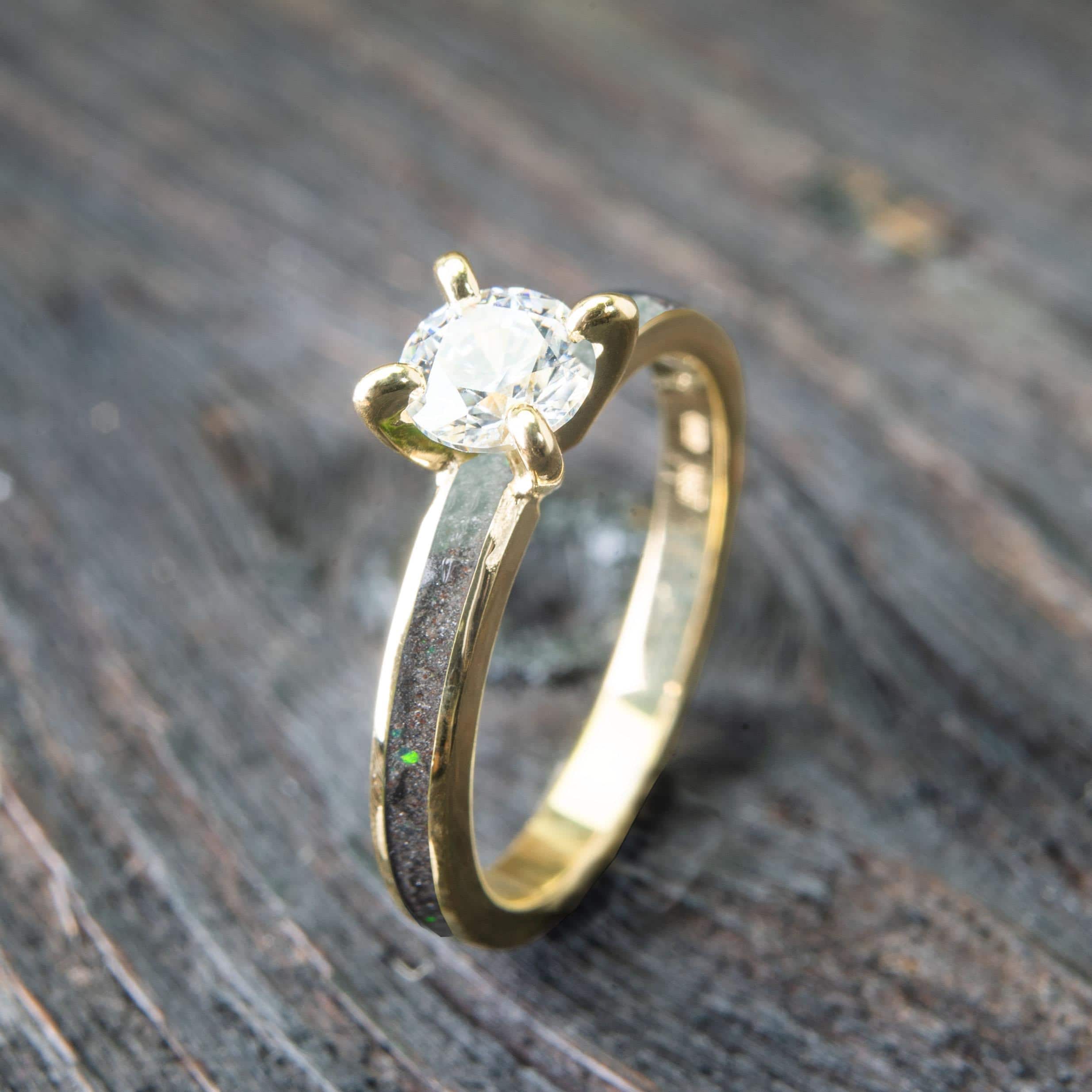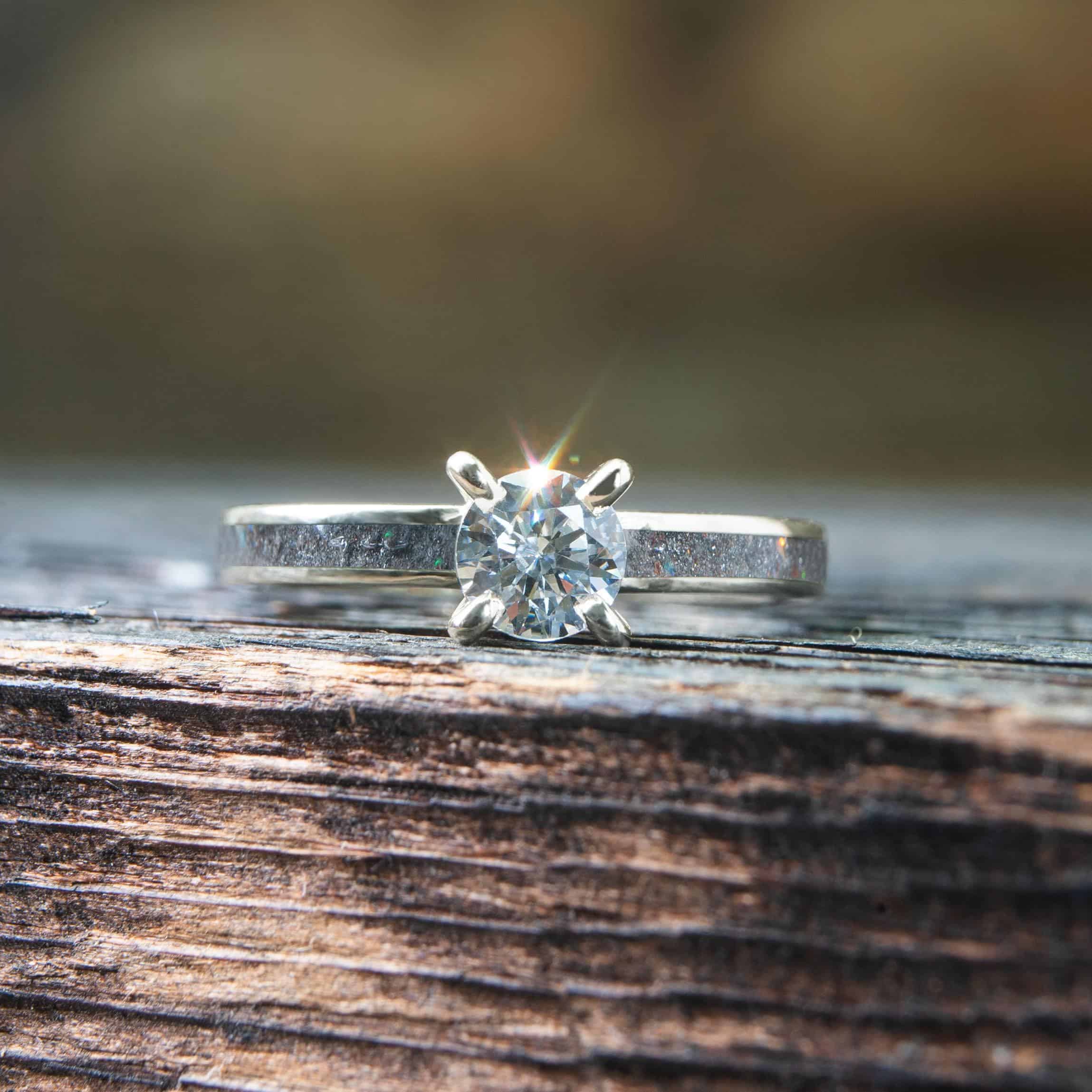 V jeho obruči sa skrýva prach z meteoritu Muonionalusta a úlomky opálu, ktoré žiaria ako hviezdy na oblohe.