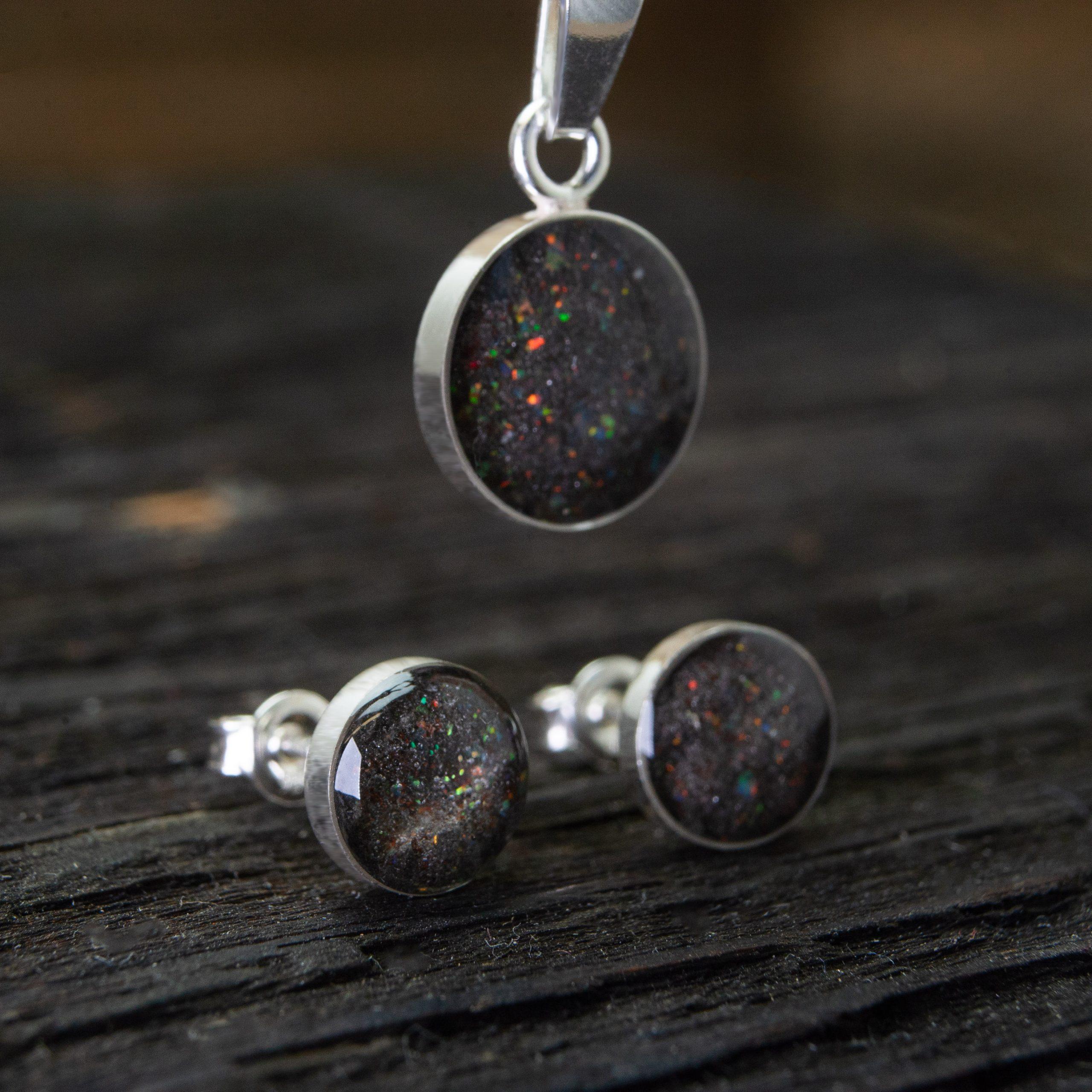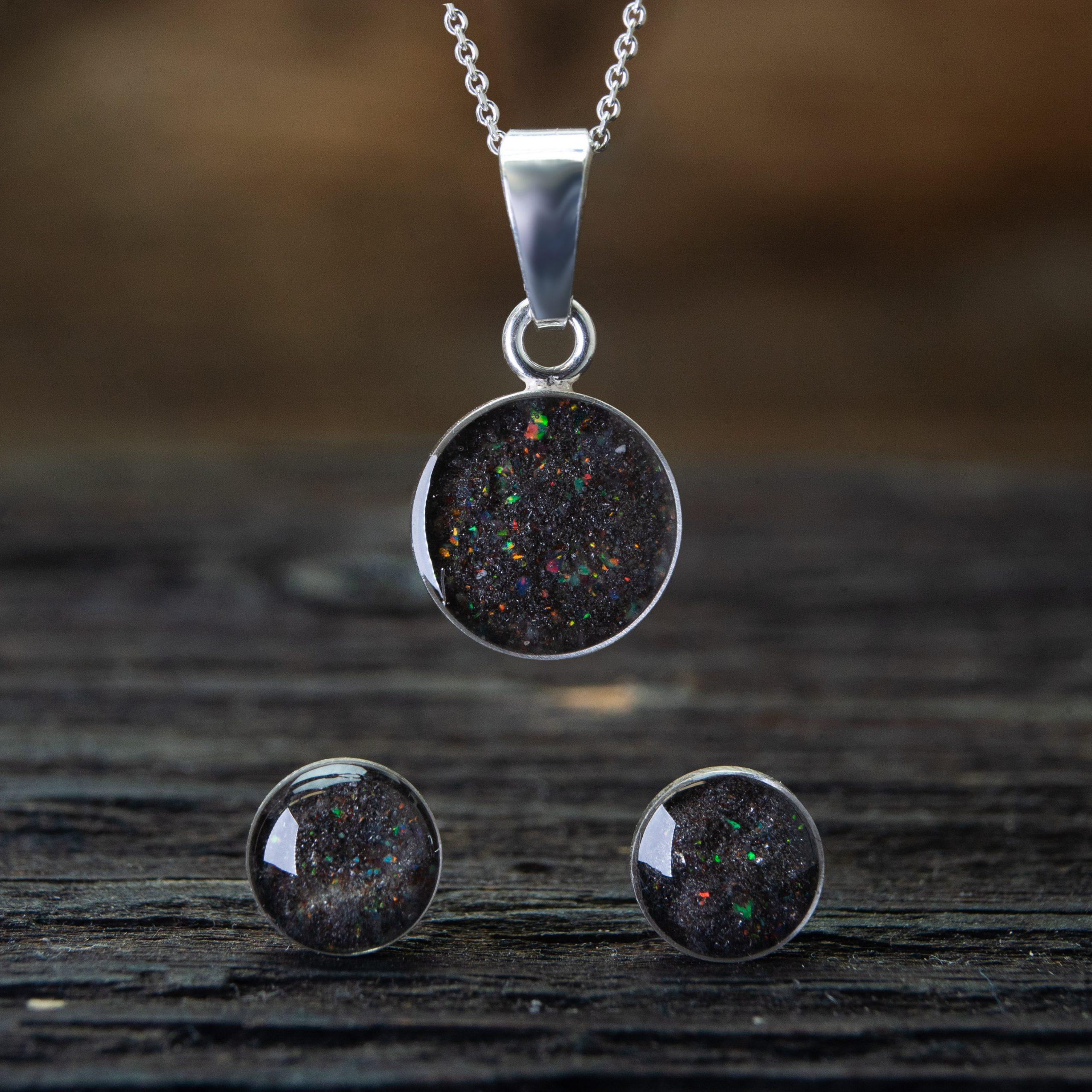 Set strieborného náhrdelníku a napichovacích náušníc s našou jedinečnou výplňou : Hviezdny prach, ktorá sa skladá z prachu meteoritu a úlomkov opálu.