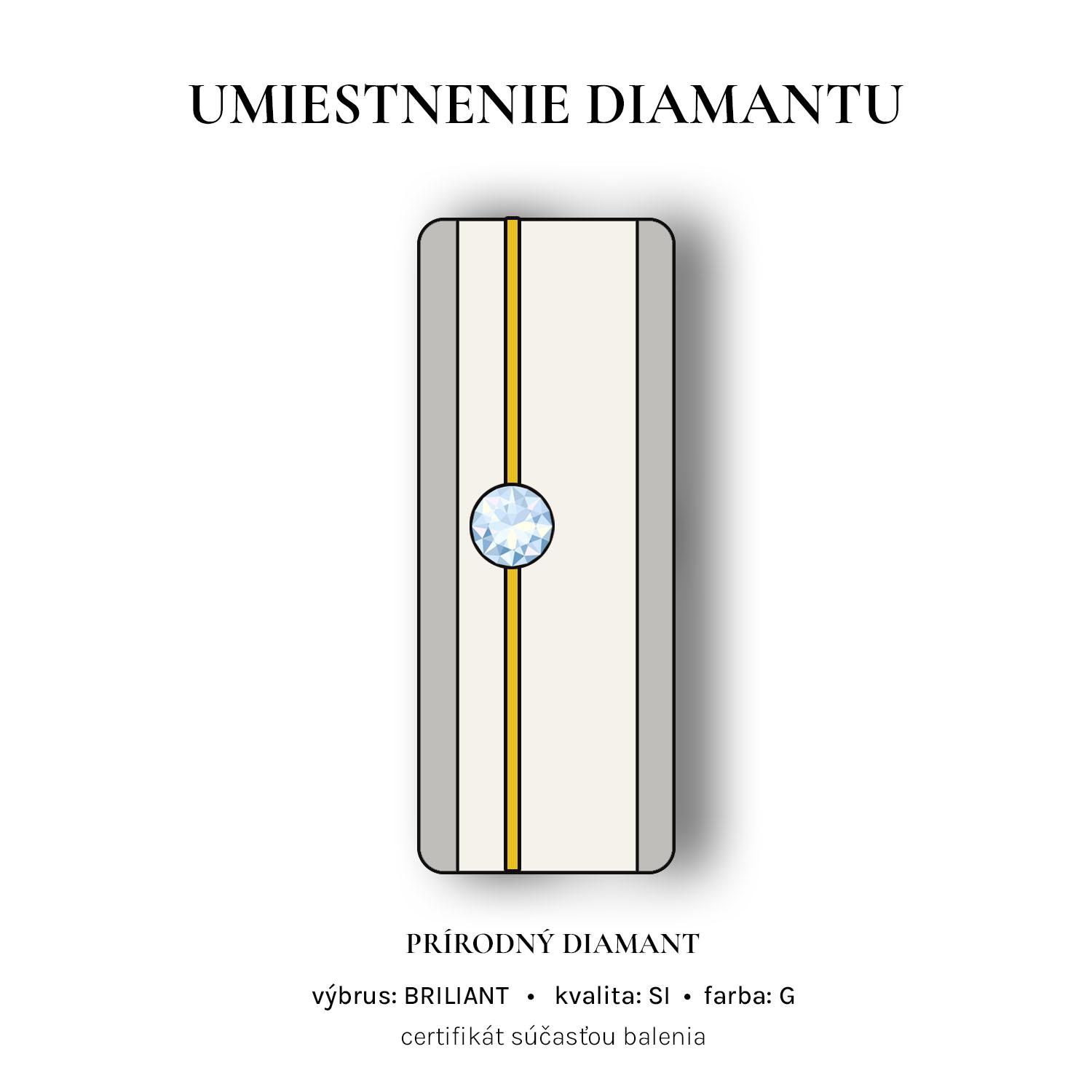 Do obrúčok je možné osadiť prírodný diamant s priemerom 1,25 mm (+40 €) alebo 1,75 mm (+60 €). Umiestnenie diamantu nájdete na nákrese v galérii.