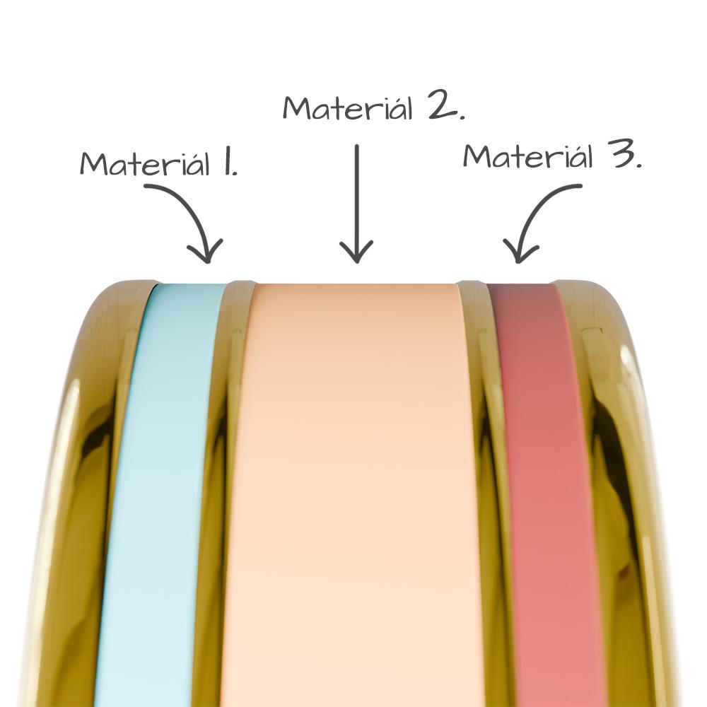 Toto jadro prsteňa je vyrobené z 14 karátového zlata a je určené na osadenie troch ľubovoľných materiálov. Dve užšie časti po stranách, širšia v strede. Materiály sú oddelené prúžkami zo zlata. Či už pôjde o materiál, ktorý nám dodáte vy sami, alebo o niektorý z tých, ktoré ste videli v našej ponuke obrúčok – výber je len na vás. Pre inšpiráciu Vám odporúčame pozrieť našu ponuku prsteňov.